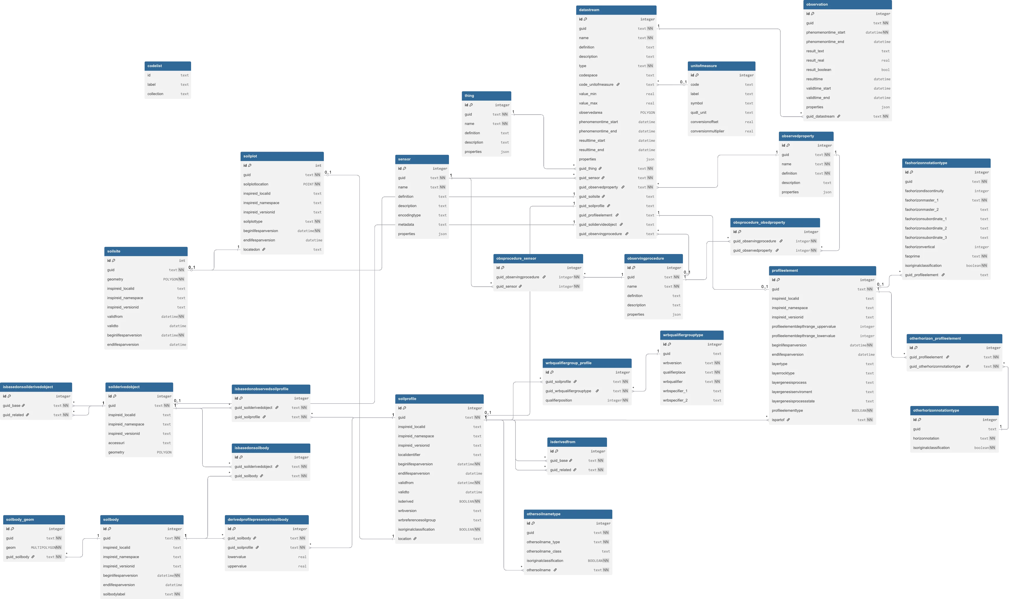 STA2 entities Thing / Datastream / Observation / Sensor / ObservedProperty are mapped to dedicated tables. Observation rows reference their Datastream, keep temporal attributes (phenomenonTime, resultTime), and a result (numeric or textual) according to STA2. This design makes the observational layer complementary to the core INSPIRE Soil features, and ready for standards‑based exposure via the STA2 API.910