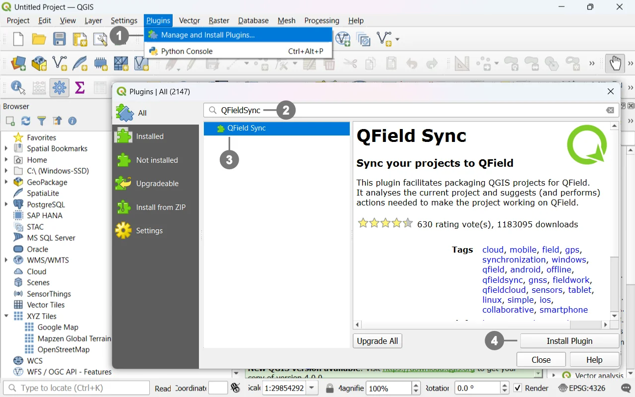 Select QFieldSync ③ and click Install Plugin.④