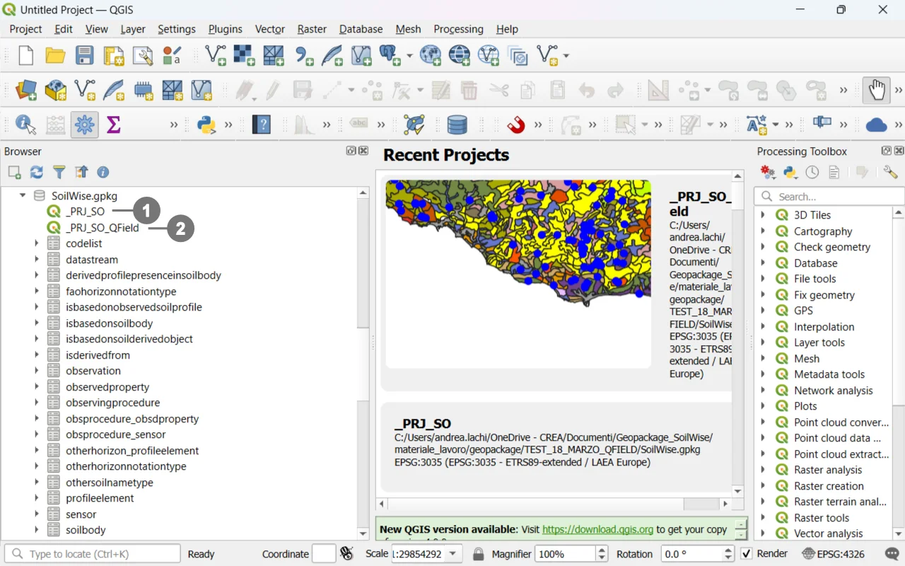 ② Project `_PRJ_SO_QField` for QField – Optimized for mobile devices with custom forms, pre‑filled fields, simplified widgets, and constraints for field data capture.
