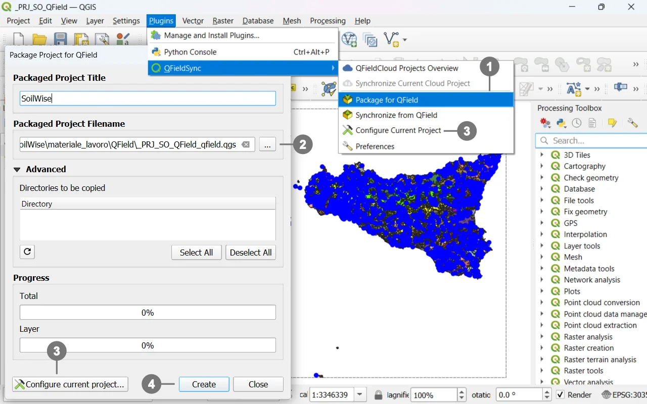 From the QFieldSync menu or toolbar, choose Export/Package for QField. ①