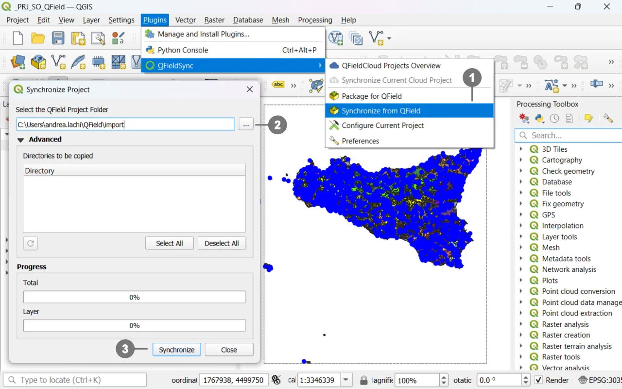 From the QFieldSync menu or toolbar, choose Sinchronize from QField. ①