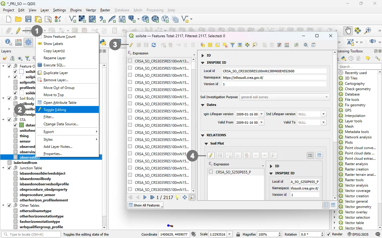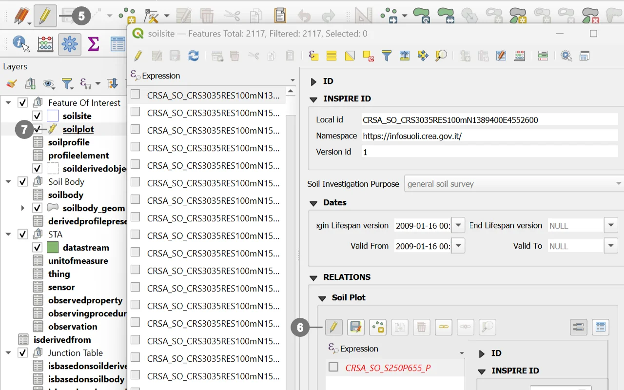 The toggle button remains in the checked (pressed) state ⑤ ⑥ to indicate that editing is enabled, and a pencil icon ⑦ appears in the Layerspanel next to the layer currently being edited.