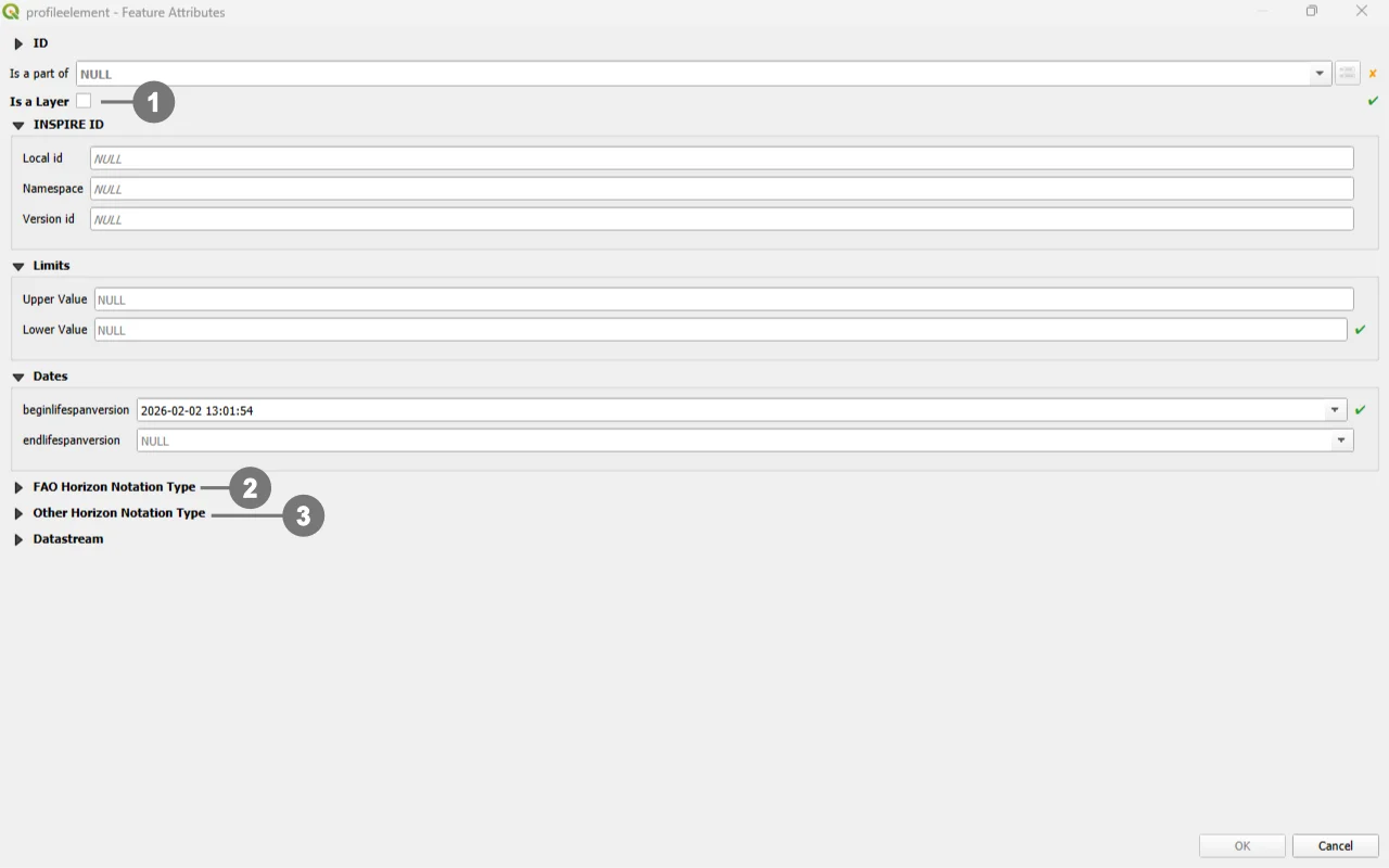 id: primary key (auto-incrementing)Begin Lifespan version: DATETIME (default: today)profileelementtype: BOOLEAN (default: 0)ispartof: TEXT (FK to soilprofile.guid)Depth range: at least one of upper/lower value must be NOT NULL (rule)id - Primary AUTO_INCREMENT INTEGER PRIMARY KEY; it’s the required identifier for GeoPackage tables and is assigned automatically on insert.